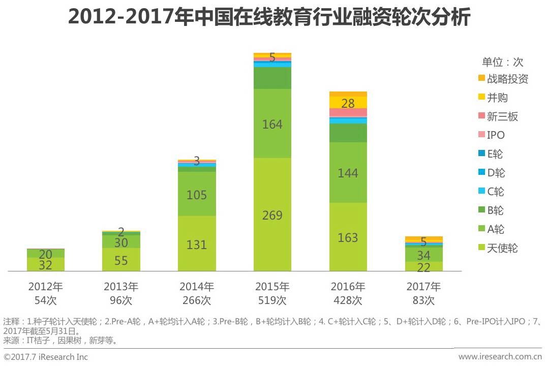 目前,国内K12在线教育形式多样,题库、微课、工具等细分市场不断被深耕,且出现亿级美元投资,资本市场的表现相当活跃。在应试体制下,中国K12阶段人口基数大、二胎政策红利及家庭收入提升等共同作用使得需求端市场空间海量,而目前供给端市场竞争格局高度分散,头部企业尚需长时间成长才能占据更大份额,故K12在线教育市场是诸多玩家的必争之地,截止2017年6月1日,K12在线教育市场共获得89次投资,超过六成大的融资集中在B轮前。虽然资本助力市场玩家不断涌入,但改领域盈利模式尚需进一步摸索。