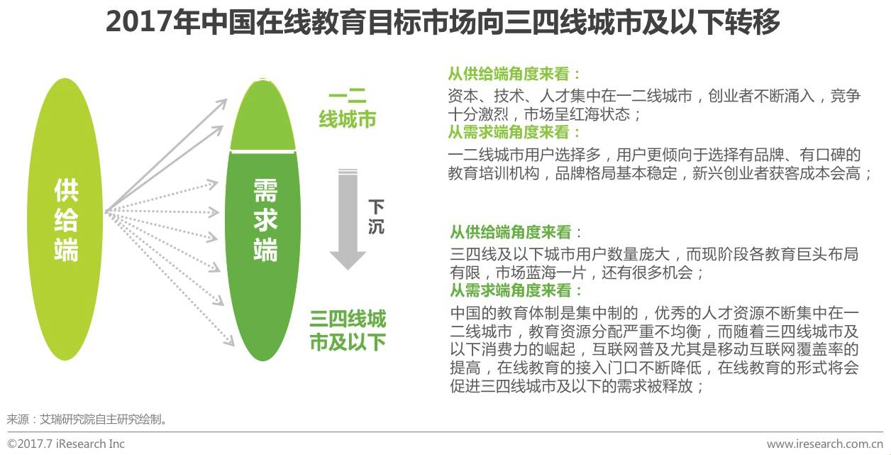 中国的教育受集中制的体制所影响,优质的人才和资源不断向一二线城市倾斜,而资本本身也聚集在一二线城市,因此无论是老牌教育机构还是新兴创业者均将目标瞄准在一二线城市,但目前该市场品牌格局基本稳定,用户选择时会倾向于具有品牌和口碑的企业,因此供给端市场红海一片;而三四线城市及以下不仅用户量巨大,而且缺乏优质的教育资源,随着基础设施的完善和消费水平的提升,对教育的需求亟待释放,而在线教育正好能打破资源分配不均衡的现状,优化资源配置,实现供需双方的共赢。