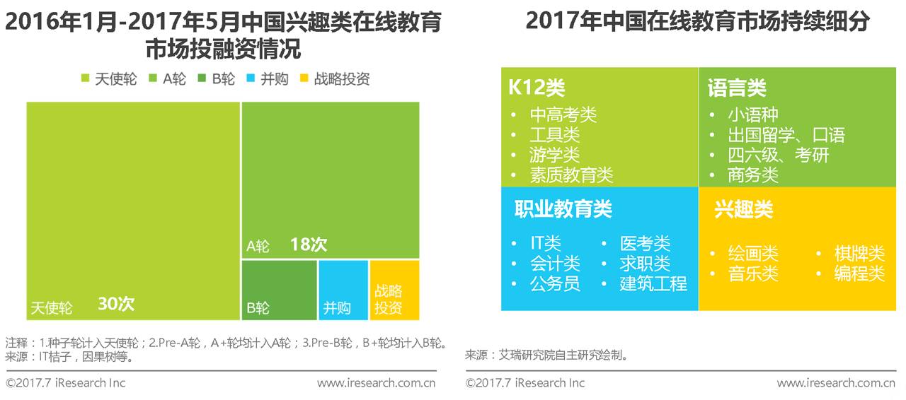 直播技术不断成熟,直播互动教学最大限度还原教学场景,而市场经过不断的教育,用户对在线教育的认可度逐渐提高。目前在线教育市场已经不再局限于语言培训、职业培训,越来愈多的教育品类开始被在线化。据艾瑞统计,截至2017年6月1日,资本市场在兴趣类领域的投资共55次,且以天使轮融资为主,兴趣类教育正在开始由线下向线上延伸。