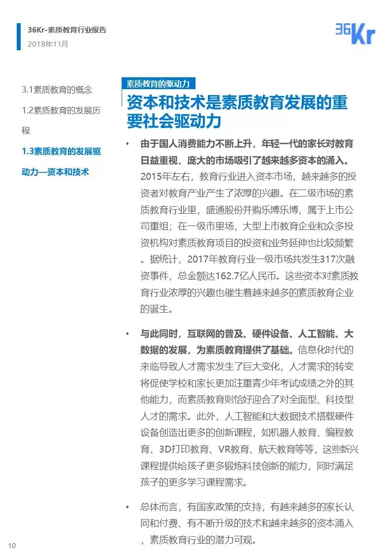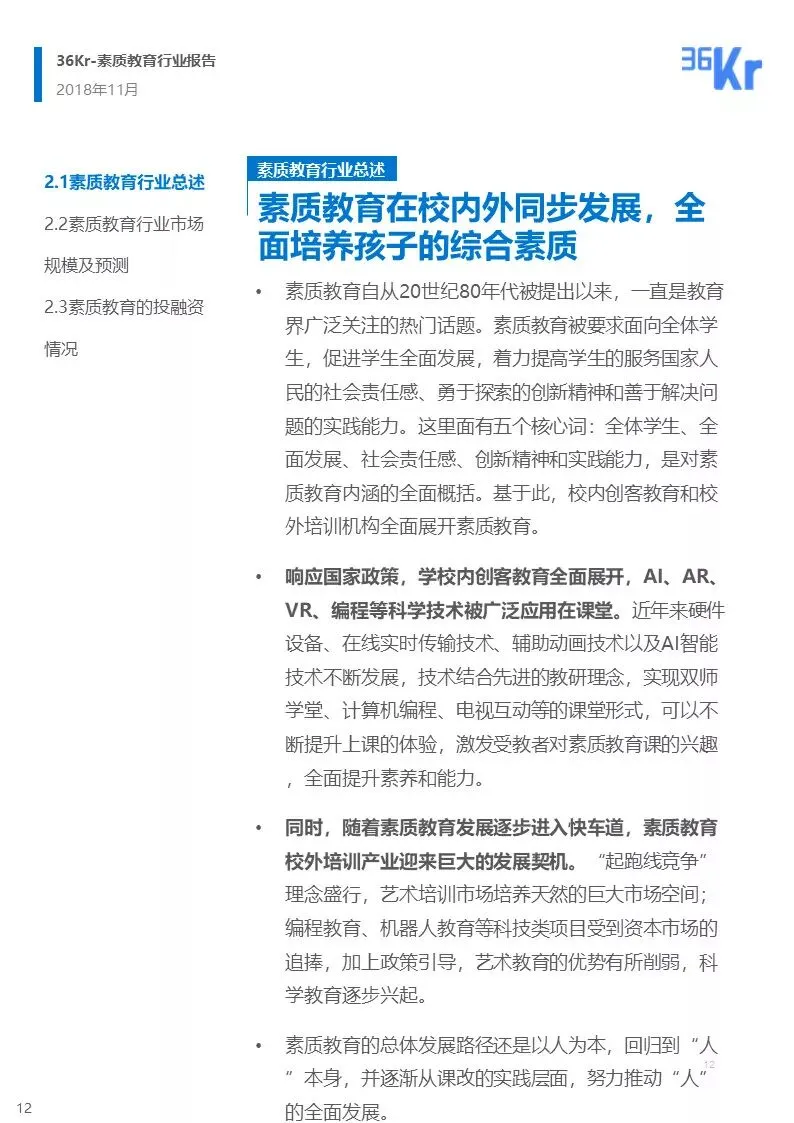 另外,人工智能技术和虚拟现实VR/AR技术进步迅速,先进的技术被迅速应用到教育领域,因此各种提升学生的综合素质和能力的课外素质教育培训机构拔地而起。