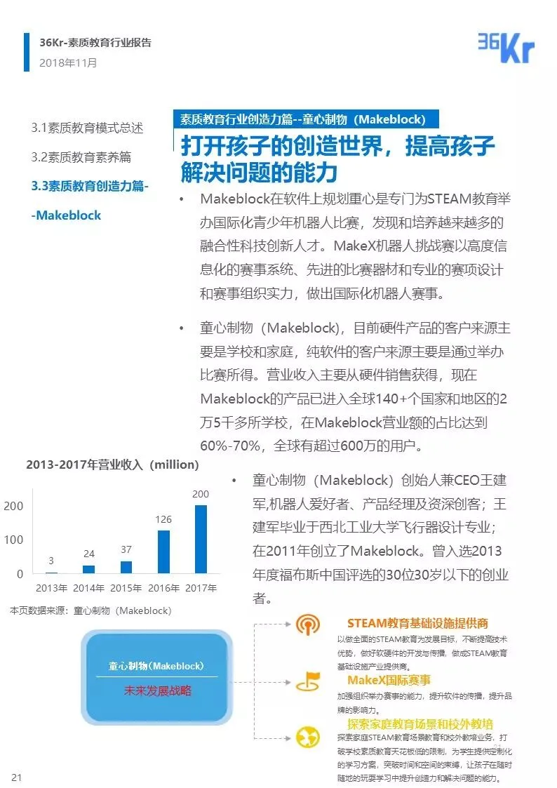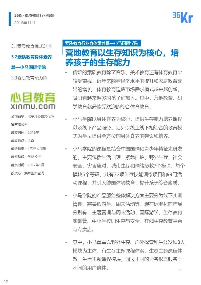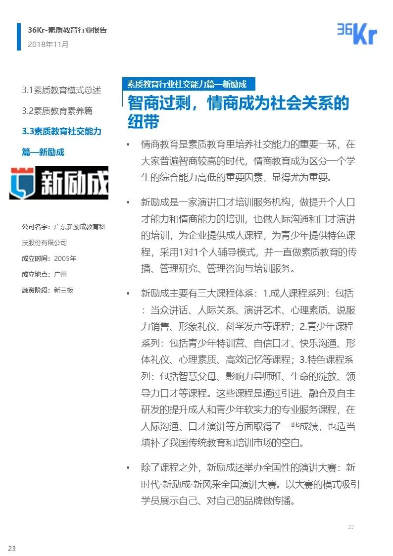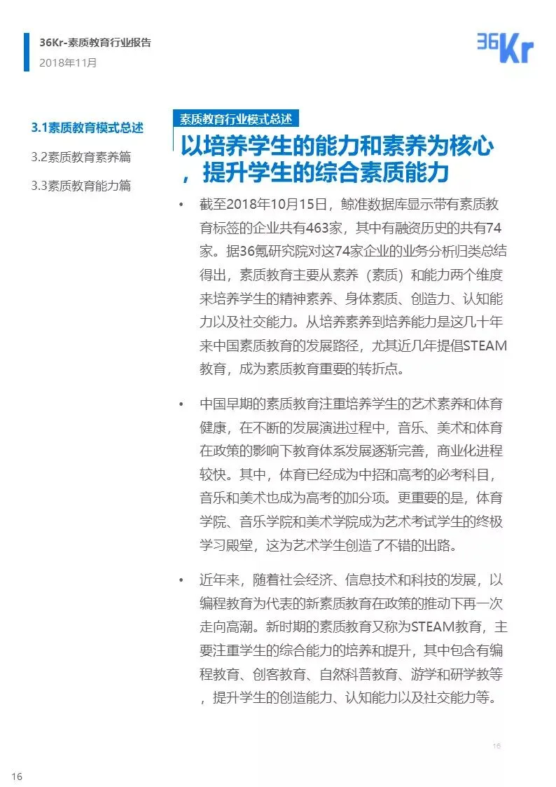 传统的素养类的素质教育企业经过几十年的发展已经相对比较成熟,逐渐趋于稳定的状态;而各种能力培养型的素质教育企业正处于崛起的好时期,发展势头已经超越传统的素质教育企业。