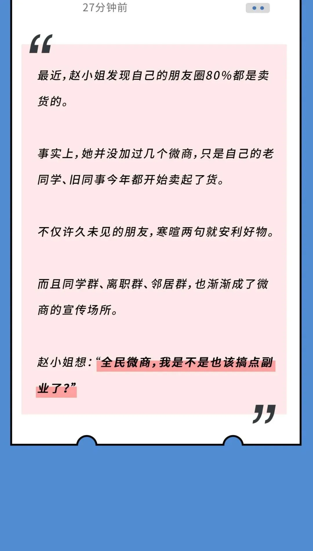 看着别人卖货赚得满盆,大家也跃跃欲试,纷纷在朋友圈干起了卖货生意。