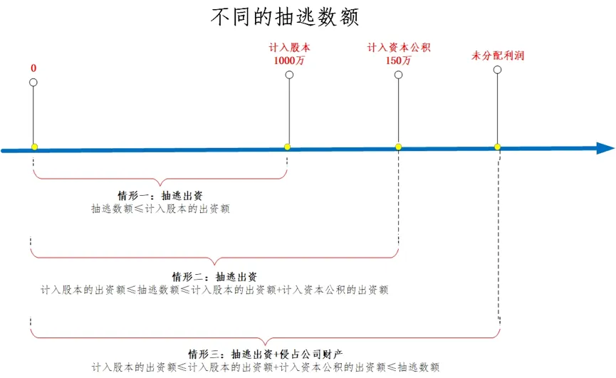 关于抽逃出资数额的讨论,存在两个颇具争议的问题,一是股东抽逃出资数额是否以其出资额为限,如果股东抽回的资金大于其出资额时,如何认定抽逃出资数额?二是股东抽回计入资本公积的出资,是否因侵蚀公司资本而落入抽逃出资的规范范围?抽逃出资数额以股东出资额为限。如果股东的抽回资金数额大于其出资额(图示情形三),在其出资额范围内成立抽逃出资,超出出资额部分按照侵害公司财产处理。[8]最高法院在(2018)最高法民申4680号一案中,即认为:“若款项属于公司成立后且注册资金已全部缴纳到位的情形下,在公司后续的生产、经营活动过程中因诉讼而获得的款项,该款项为公司经营期间的收益,应属于其公司资产。股东转移上述款项的行为固然损害了公司的财产权,但其行为并未侵蚀到公司的资本,不构成抽逃出资行为。”抽逃出资包括抽回资本公积。如前所述,所有者权益主要包括股本、资本公积、盈余公积和未分配利润四个科目。其中,股本是股东实缴注册资本的汇总,资本公积对应着超出注册资本的股权溢价,盈余公积是公司每年从税后利润中提取的部分,未分配利润是历年利润累积。股东未经法定程序抽回盈余公积或未分配利润落入违法利润分配的规制范畴,股东抽回资本公积应当如何定性素有争论。我们认为,抽逃出资包括抽回资本公积。资本公积科目是记载股东作为出资缴付但未计入股本的溢价数额,是公司资本的重要组成部分。在(2013)民提字第226号一案中,最高法院即认为:“资本公积金属于公司的后备资金,股东可以按出资比例向公司主张所有者权益,但股东出资后不能抽回,也不得转变为公司的债务计算利息,变相抽逃。”
