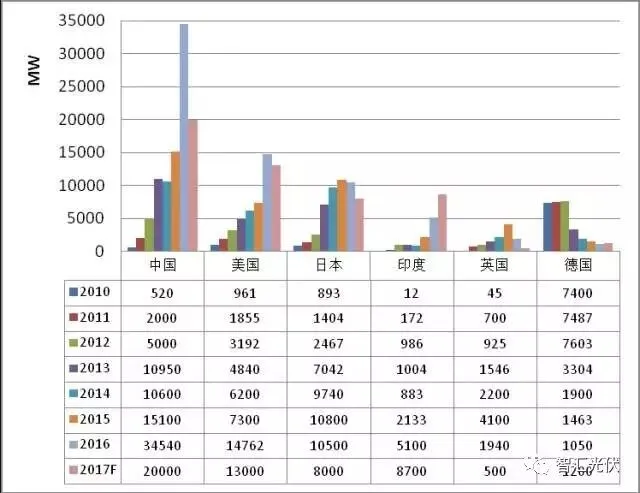 2016年是全球光伏装机增长的一个里程碑。据德国太阳能协会最新发布的统计数据显示,2016年全球光伏新增装机70GW,比2015年增长大约30%,至此,全球光伏装机总量达到300GW。在2016年的新增装机量中,中国贡献了34.54GW,与2015年新增装机量相比,同比增长了128%,累计装机容量77.42GW,新增和累计装机容量均为全球第一。美国2016全年光伏装机14.76GW,装机量同比增长97%,其中公共事业装机量起到了主要的拉动作用。