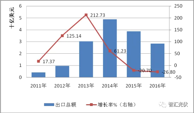 印度在2016年一跃成为我国光伏组件出口的第二大市场,2016年,我国对印度光伏组件出口金额24.59亿美元,较2015年同比增长78.68%。