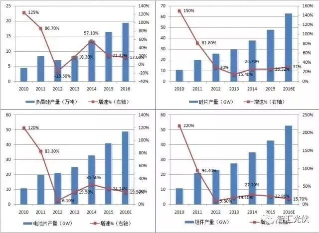 图表 10 2010-2016年我国多晶硅、硅片、电池片以及组件产量情况