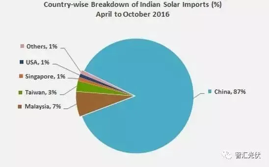 在我国光伏组件对印出口大幅上升的同时,印度光伏行业对中国产品的依赖度也在上升,据印度商务部统计,在2016年4-10月期间,在印度光伏产品进口来源国中,中国产品已经占据了87%的市场,其次为马来西亚,但占比仅7%,排在第三位的中国台湾,占比也仅有3%。