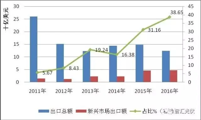 2016年,美国市场占中国组件出口的市场份额下降到11%,出口金额下降20.33%,为14.27亿美元。