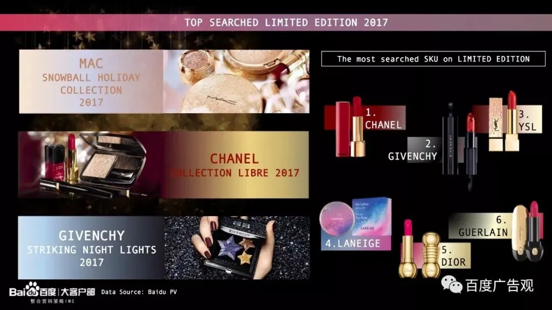 我们单独分析了有关“彩妆限量版“的关键词的检索趋势,发现在第四季度相关关键词检索量相比2017年的其他月份均值暴增5倍。这里我们又不得不提到2016年限量彩妆中的DIVA ”YSL星辰”,它的推出和爆红也打通了中国消费者对“限量版”特别是“圣诞限量版”追求的任督二脉。