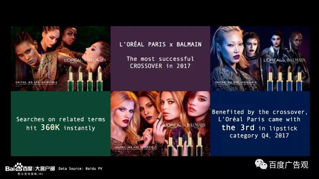 在这些跨界合作中,最让人印象深刻的,就是L’OréalParis X Balmain的时尚时尚最时尚的口红跨界。10月一经推出,光“欧莱雅Balmain”这个关键词在百度上的检索量就立即飙升至36万。也归功于这套好像涂上马上就酷到能去走T台的唇膏,L’Oréal Paris 也一跃跻身第四季度口红品牌检索量排行前三。