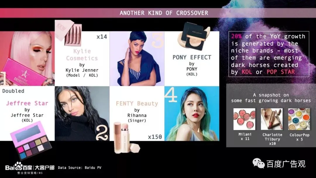 在这些品牌中,Jeffree Star, Kylie和Pony都是拥有自己美妆频道的彩妆达人, 他们通过网络迅速走红,在试用点评推荐了无数彩妆产品后,他们带着自己对彩妆产品的独到见解和彩妆流行趋势的敏锐度,投身到了创造自有品牌的事业中。认同、拥护他们的消费者也因为有了这些KOL彩妆教程的背书,对这些自有品牌投来关注。此外,Rihanna作为位列他们中的大V,不,巨V,不光将自己的业务范围伸到了FASHION界(Fenty X PUMA)也同样以Fenty的名号创造了Fenty Beauty, 并且以和Rihanna本人一样酷的外表和Rihanna的业务一样优质的产品迅速虏获彩妆消费者的心。