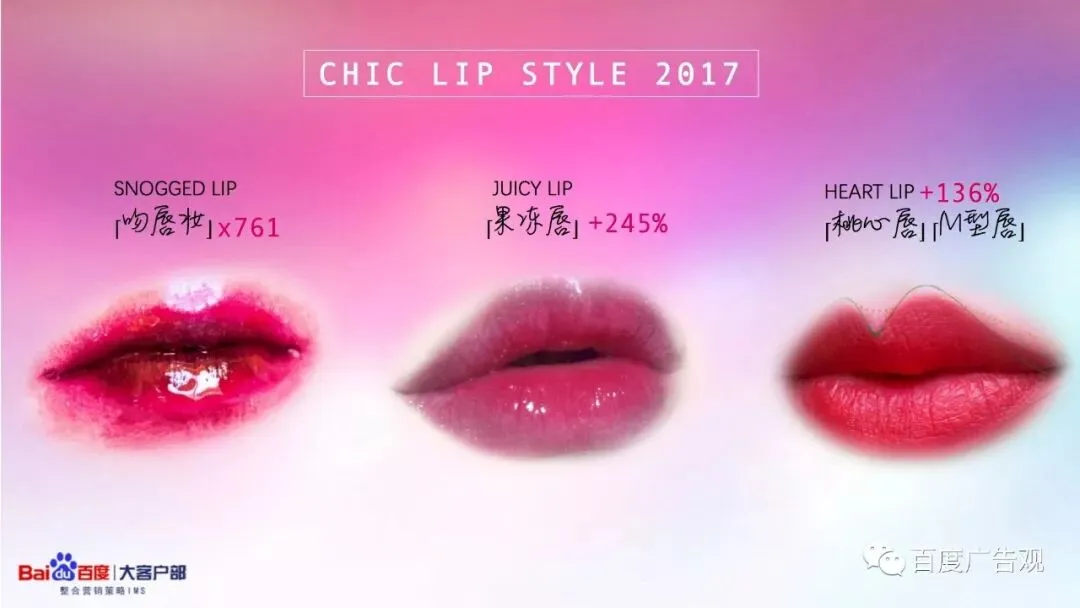 这些新鲜的搜索趋势也体现了消费者在有了越来越多的唇部产品的选择后, 开始追求更多在唇部妆容的花样。
