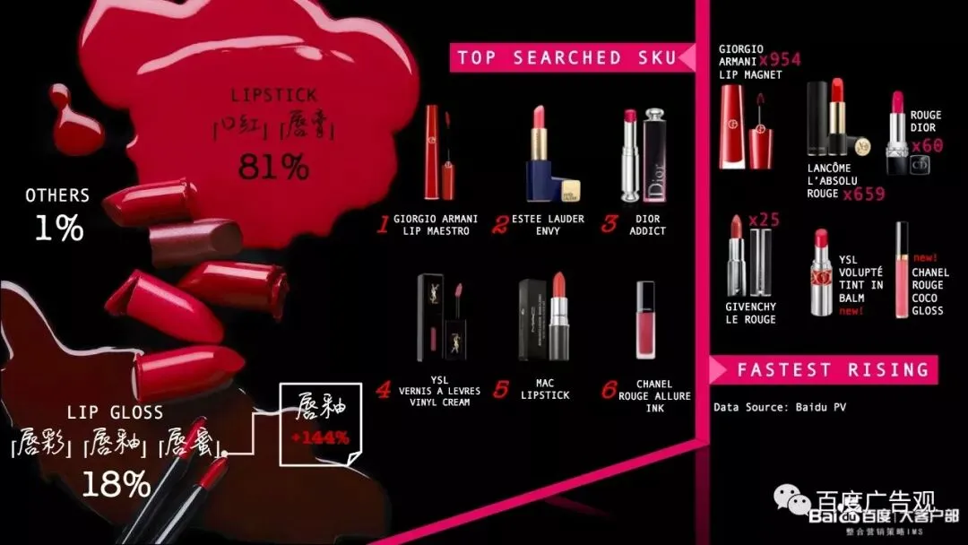 从SKU的排名我们也能看到, 在最高检索的产品中,前六里有三支是唇釉——Gorgio Armani,YSL和Chanel,同时Dior的Addict也是固体唇釉产品。而在增长最快的榜单中,阿玛尼的小胖丁和Chanel的唇露也是lip gloss的范畴, 可见消费者对唇釉、唇蜜质地的逐渐追捧和喜爱。