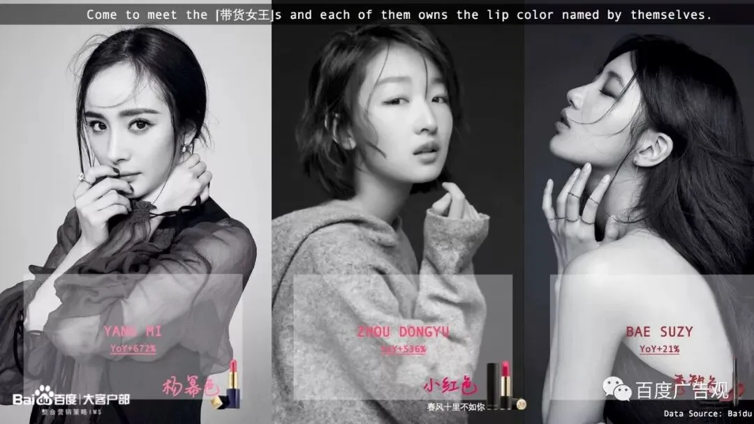 让我们最后来见见2017年唇膏界的带货女王。雅诗兰黛官宣了杨幂为代言人之后,她带货体质继续发光发热,杨幂同款口红搜索激增近7倍;少女系掌门周冬雨一部《春风十里不如你》,一抹娇艳的小红色,也拉动了同款兰蔻菁纯唇膏近6倍的检索增长;而一路从2016年火到2017年的秀智色,由于本身口红色系正直大火,今年呈现了持续增长。