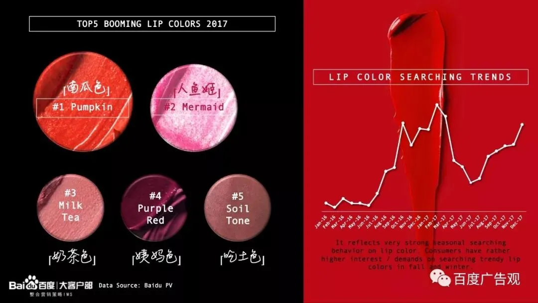 以南瓜色为代表的“佛系色”在2017年年末实实在在火遍了街头巷尾,其中也包括了榜单中出现的奶茶色和吃土色和没有在榜单上,但在我们化妆包里的脏橘色和枫叶色。偏红棕调的唇膏色抢眼却稳重,让冬季里的妆容立体又精致。中国彩妆消费者对口红颜色的追求也正变得越来越大胆和犀利,同时秋冬季节正在成为消费者关注和追求唇膏颜色的重要时间节点,下一个F/W的唇膏色彩又会是什么?让我们拭目以待。