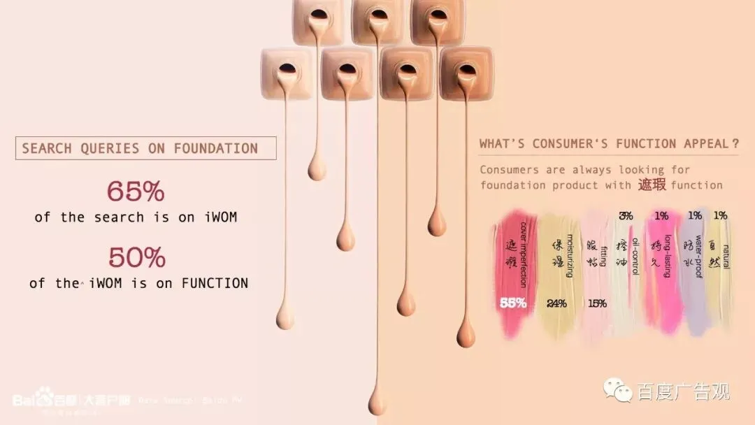而细究起关于粉底液的检索词,我们发现,针对粉底液的搜索中有65%是关于产品的口碑的搜索,而这其中,一般的口碑类的搜索都是关于功效的。那么针对粉底液,消费者的功效诉求是什么呢?