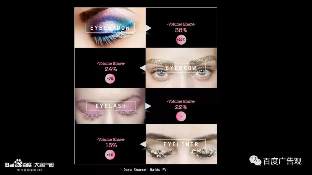 虽然眼部所占的份额没有唇部和脸部大,但是消费者对于眼妆技巧和色彩的探索正在成为新的彩妆趋势!