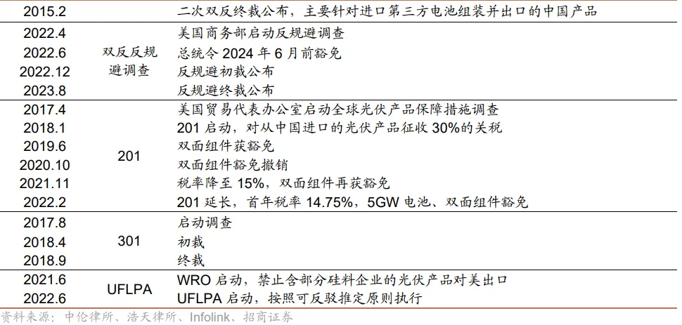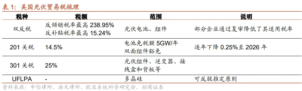 3、301关税:2018年发起,针对中国对美出口商品(涉及2000亿美元)的贸易税,其中涵盖光伏组件、逆变器、接线盒、背板、支架等全产业链产品,目前税率为25%;
