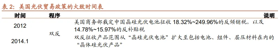 1、双反税:2012年,美国针对中国光伏电池与组件产品开启首次反倾销、反补贴(双反)调查,并于2015年二次调查。目前针对中国制造的电池及组件产品最高反倾销、反补贴税率分别为238.95%、15.24%,部分中国企业通过复审降低了其适用税率;