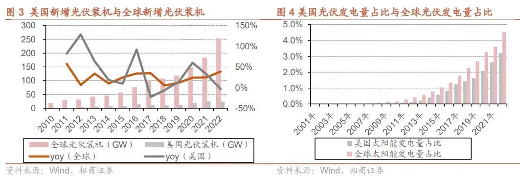 美国市场具备较大发展潜力。从发电量角度看,美国发电量为4.55万亿千瓦时,其中光伏发电量为0.15万亿千瓦时,光伏发电量占比为3.2%,显著落后全球4.5%的水平。从装机角度看,2022年美国光伏累计装机140.23GW,2022年新增装机23.62GW,装机绝对值相对较低。