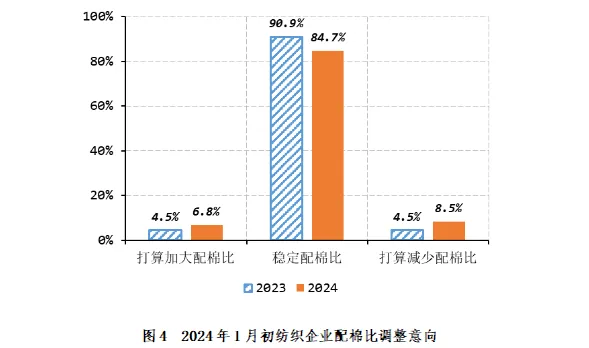 配棉意向调查显示,2024年1月初,84.7%的抽样企业打算稳定配棉比,环比减少2.2个百分点,同比减少6.2个百分点,比近五年同期平均水平减少8.0个百分点;6.8%的企业打算加大配棉比,环比增加3.9个百分点,同比增加2.2个百分点,比近五年同期平均水平增加3.3个百分点;8.5%的企业打算降低配棉比,环比减少1.7个百分点,同比增加3.9个百分点,比近五年同期平均水平增加4.7个百分点(如图4)。