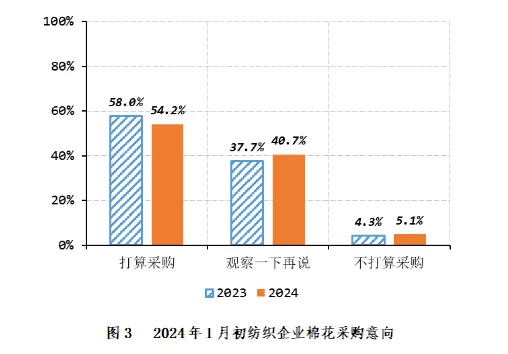 采购意向调查显示,2024年1月初,准备采购棉花的企业占54.2%,环比增加13.7个百分点,同比减少3.7个百分点,比近五年同期平均水平减少8.5个百分点;持观望态度的占40.7%,环比减少1.4个百分点,同比增加3.0个百分点,比近五年同期平均水平增加8.1个百分点;不打算采购棉花的企业占5.1%,环比减少12.3个百分点,同比增加0.7个百分点,比近五年同期平均水平增加0.4个百分点(如图3)。