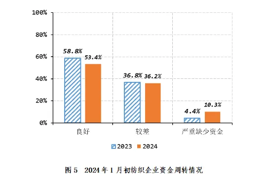资金周转调查显示,2024年1月初,资金周转良好的企业占53.4%,环比增加3.4个百分点,同比减少5.4个百分点,比近五年同期平均水平减少7.2个百分点;资金周转较差的占36.2%,环比减少6.4个百分点,同比减少0.6个百分点,比近五年同期平均水平增加5.7个百分点;严重缺少资金的占10.3%,环比增加3.0个百分点,同比增加5.9个百分点,比近五年同期平均水平增加1.5个百分点(如图5)。