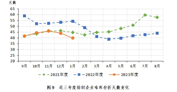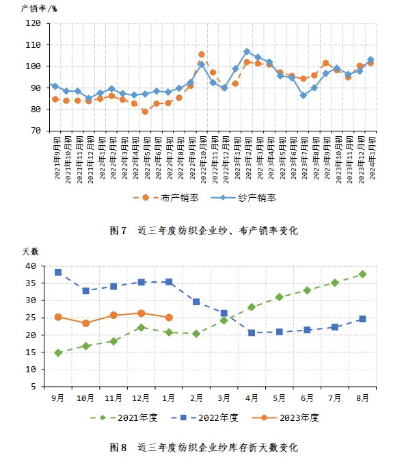 2024年1月初,被抽样调查企业纱产销率为103.2%,环比提高5.3个百分点,同比提高4.2个百分点,比近五年同期平均水平提高9.5个百分点;库存为25.1天销售量,环比减少1.2天,同比减少10.2天,比近五年同期平均水平增加1.6天(如图7、图8)。布的产销率为101.5%,环比提高1.2个百分点,同比提高9.4个百分点,比近五年同期平均水平提高12.0个百分点;库存为39.9天销售量,环比减少4.2天,同比减少14.5天,比近五年同期平均水平减少3.1天(如图7、图9)。