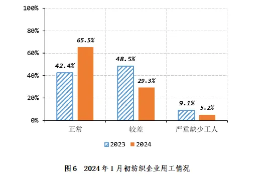 2024年1月初,65.5%的抽样企业用工情况正常,环比增加1.3个百分点,同比增加23.1个百分点,比近五年同期平均水平增加6.2个百分点;29.3%的企业用工情况较差,环比减少2.0个百分点,同比减少19.2个百分点,比近五年同期平均水平减少2.5个百分点;5.2%的企业严重缺少工人,环比增加0.7个百分点,同比减少3.9个百分点,比近五年同期平均水平减少3.7个百分点(如图6)。