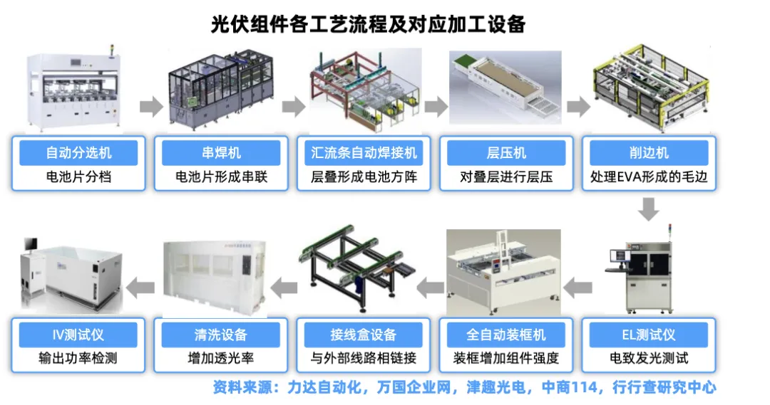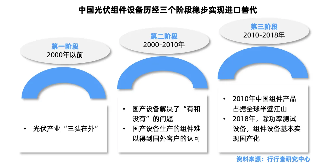 然而相较于国外先进设备生产的组件产品,国产设备所生产的组件难以赢得外国客户的认可。2010年至今:2011年全国能源工作会议明确提出把光伏产业培养成为中国先进的装备制造产业和新兴能源支柱产业。随着技术难关的攻克,国产组件设备在价格端具备更大的优势,交货周期更短,服务响应更为及时,国产光伏组件设备产业真正实现腾飞。2018年以后除功率检测设备,组件设备基本实现进口替代。光伏组件位于产业链中游