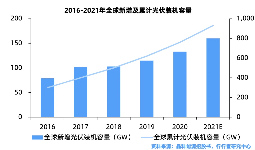 凭借成本以及碳减排优势,光伏发电已经成为了全球新增发电的主力,根据国际能源署(IEA)发布的数据显示,在2020年新增发电装机容量中,光伏发电位列第一,约占2020年全球新增发电装机容量的39%。2020年全球光伏市场新增装机量为130GW,累计光伏发电装机总量达到756GW。