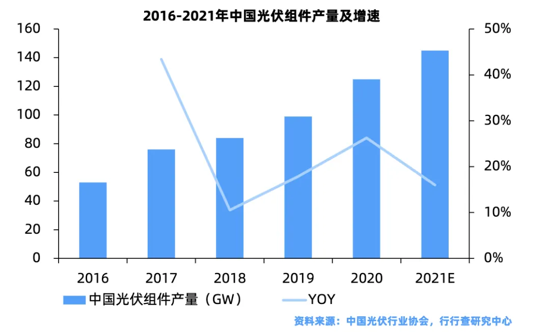 根据中国光伏行业协会数据,2020年我国多晶硅产量约39.6万吨,同比增长15.8%;硅片产量161GW,同比增长19.7%;电池片产量135GW,同比增长22.2%;组件产量125GW,同比增长26.4%。