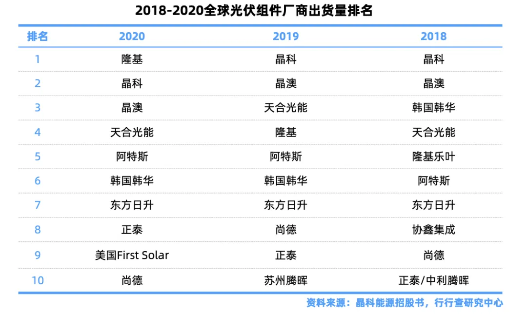 在2020全球十大组件出货商中,国内组件厂商稳定占据8个及以上席位,分别为隆基股份、晶科能源、晶澳太阳能、天合光能、阿特斯、东方日升、正泰、尚德,国外品牌仅有韩国QCells(韩华)、美国FirstSolar进入前十,分别位列第六与第九。近年来,全球光伏组件市场竞争激烈,市占率将持续向头部企业集中。2020年全球光伏组件市场份额排名前五厂商分别为隆基股份、晶科能源、天合光能、晶澳科技及阿特斯,其市占率累计达70%。