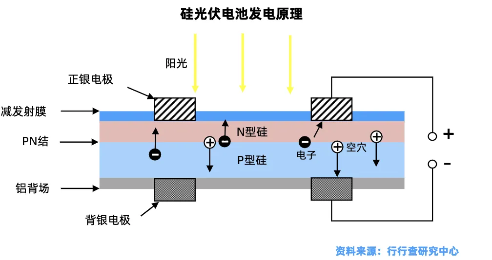 光伏电池是光伏系统中光电转换的关键元件,用于把太阳的光能直接转化为电能,经过串联后通过封装保护形成太阳能电池组件,再配置控制器及安装系统支架等部件形成光伏发电装置。光伏电池的生产工艺从硅片到可工作的电池片主要需要七道工艺流程完成备制:制绒清洗→扩散制结→刻蚀→二次清洗→制备减反射膜→印刷电极→烧结。光伏电池发电原理光伏发电是利用半导体界面的光生伏特效应而将光能直接转变为电能的一种技术。当光线照射在光伏电池上并且光在界面层被吸收,具有足够能量的光子能够在P型硅和N型硅中将电子从共价键中激发,以致产生电子空穴对。在P-N结内建电场的作用下,空穴由N区流向P区,电子由P区流向N区,接通电路后就形成电流。本文节选自行行查报告库《2021年中国光伏行业研究报告》