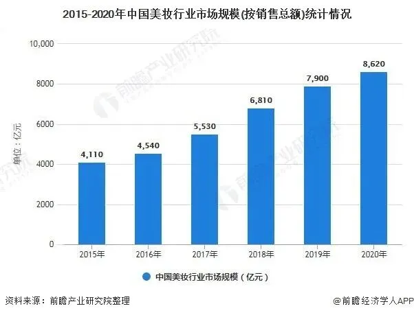 受益于我国消费升级的大趋势以及美妆社交平台的发展等因素,我国的美妆行业发展迅速。包括护肤、彩妆、香水和个人护理在内的美妆市场销售总额从2015年的4110亿元增长到2020年的8620亿元,2015-2020年的复合增长率达到16.0%。