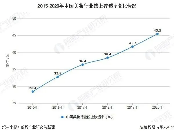 中国的美妆电商发展迅速,2015年中国美妆行业的线上渗透率仅为28.4%,到了2020年,中国美妆行业线上渗透率已经达到了45.5%。