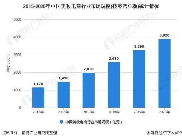 图表5:2015-2020年中国美妆电商行业市场规模(按零售总额)统计情况