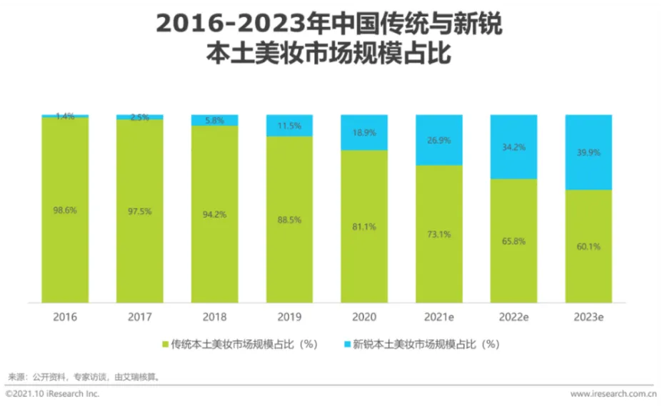 图表9:2016-2023年中国传统与新锐本土彩妆市场规模占比