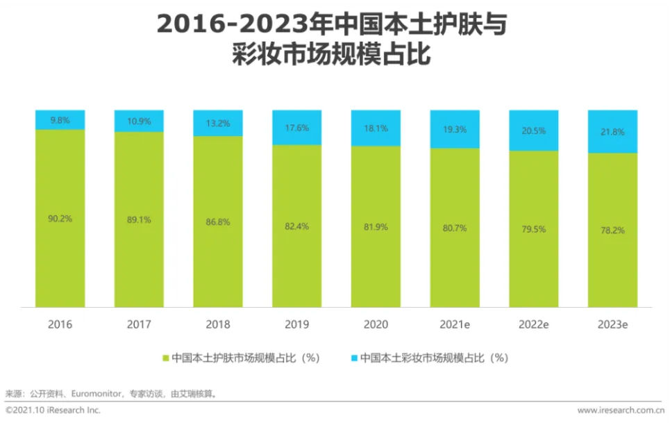 图表8:2016-2023年中国本土护肤与彩妆市场规模占比