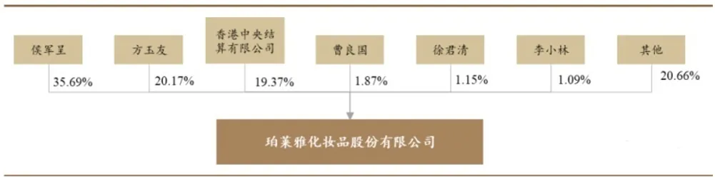 从内部管理层结构进行分析,珀莱雅集团控股相对集中,决策效力高度自控。珀莱雅是家族股权相对集中的企业,截止至21年三季报数据,董事长侯军呈持有超过三分之一的集团股份(35.69%),其妻弟方玉友持有20.17%的股份。董事长侯军呈主要负责对外工作事物,如政府关系、资金往来、化妆品协会沟通、海外投资机会等;方玉友作为公司董事及总经理主要负责对内全面经营管理;董事长侯军呈之子侯亚孟担任公司董事兼副总经理。