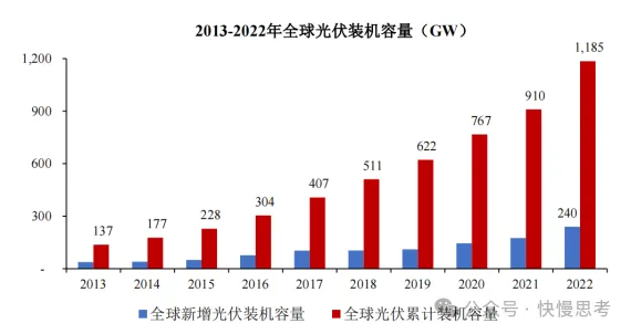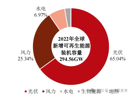 相对于传统能源,太阳能具有持久性、清洁性和普遍性等优点,光伏逐渐成为新能源领域重点发展的产业之一。根据国际可再生能源署(IRENA)统计,2022年有294.56GW的新增可再生能源投入使用,光伏占比达到65.04%,其次是风力和水电。