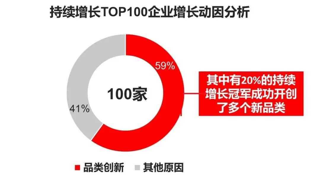 2022年6月21日,里斯战略定位咨询发布《中国上市企业持续增长的力量——品类创新研究报告》。报告指出,近六成中国持续增长冠军企业的增长动力来自于开创并占据一个新品类。一次品类创新平均可以再造3个百亿级企业。回顾新品类诞生的时间,报告揭示了两个明显的品类创新高峰,下一波持续增长企业或就将在不远的 2025 年前后集中爆发。里斯战略定位咨询通过对6721家中国上市企业2016-2020年的数据进行追踪,发现仅有2042家企业保持5年的连续增长,“持续增长企业”占比为 30.4%。其中,能够连续跑赢当年GDP增速的企业则仅有1251家,数量不到二层。里斯战略定位咨询中国区合伙人刘坤认为,伴随着肆虐全球的新冠疫情和竞相爆发的国际冲突事件等诸多不确定因素,持续增长对企业而言,变得日益稀缺和充满挑战。保持持续增长现已成为众多企业的首要课题。根据中国上市企业2016-2020年的5年复合增长率,选取了前100的企业,即“持续增长冠军企业TOP100”,里斯战略定位咨询以此为样本,对于这些企业发展历程和业务数据进行大量分析后指出,近六成持续增长冠军企业的增长动力来自于开创并占据一个新品类。其中,又有六成新品类的开创者成为了新品类的领导者。这些新品类不但成为了企业营收的重要组成部分,也是企业增长的重要来源。据数据统计显示,品类创新为这些持续增长的冠军企业带来了超两万亿的营收规模,一次品类创新平均可以再造3个百亿级企业,成为企业增长的支柱力量。