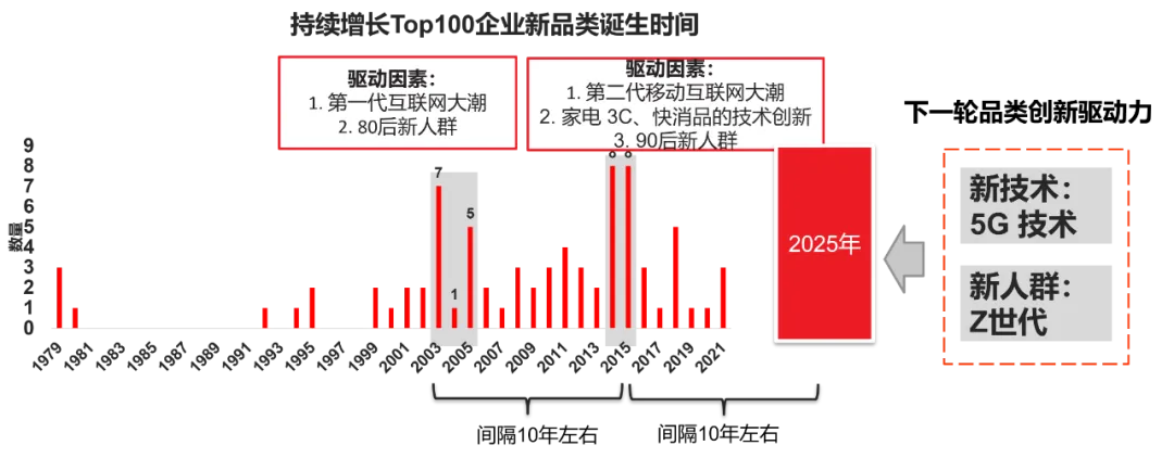 刘坤指出,创新力存在两个临界点,一亿和一百亿。当企业营收突破一亿之后,品类创新的成果可以得到有效地转化,但达到一百亿时,企业的创新力又会遭遇瓶颈,陷入创新者的窘境。回顾历史品类诞生的时间周期和规律,里斯战略定位咨询研究显示,自进入21世纪以来,商业经历了两轮品类创新高峰期。第一轮为2003-2005年,三年时间内共诞生了淘宝、京东、梦百合、皮阿诺等 13 个持续增长冠军企业。第二轮为2014-2015年,两年时间里共诞生了拼多多、全民K歌、小牛、润百颜等多达 16 个新品类。这两大爆发期间隔十年,但都是由互联网的升级迭代和新人群新需求,这两大因素所驱动。现今技术和需求正在孕育新的大变革,品类创新驱动力正在形成中,2025年或将迎来下一个新品类爆发期。