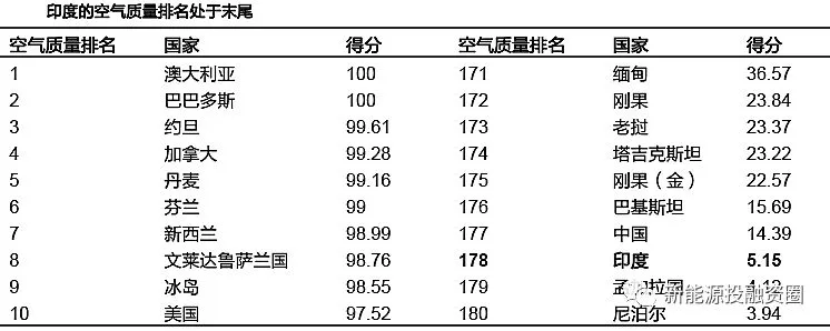 印度的环境问题十分突出,根据耶鲁大学和哥伦比亚大学发布的2018年版的全球180个国家环境绩效指数(EPI,Environmental Performance Index)报告,印度的EPI指数为30.57,排名180个国家的第177位。根据Energyworld,约有2.6亿印度人(20%)使用传统燃料——柴火、农业废料和生物质燃料来烹饪和满足一般取暖需求。这些传统燃料的燃烧会释放出大量的烟雾、PM10颗粒物、NOX、SOX、多环芳烃、甲醛、一氧化碳和其他空气污染物,这使得印度的空气质量比较糟糕,根据耶鲁大学的研究结果,印度的空气质量在180个国家排名居第178位,仅仅好于孟加拉国和尼泊尔。