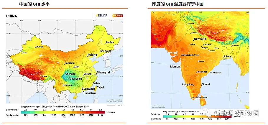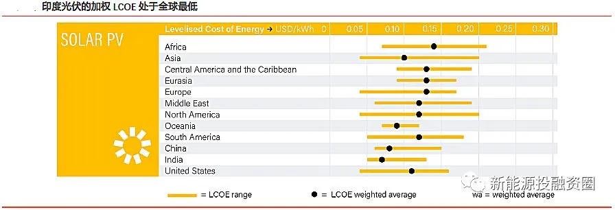 但由于印度具备得天独厚的光照条件,并且印度的光伏系统造价处于较低水平,根据IRENA的数据2017年印度光伏的每KW加权造价成本为971美元,甚至要低于当时中国的系统造价,综上,全球领先的光照时间和低成本造价使得印度即使在较高利率的水平下,仍然实现了较低的度电成本。