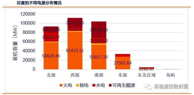 从装机结构分布来看,印度清洁能源电力装机主要集中于印度的南部,北部和西部地区,南部区域的非水电可再生能源装机超过35 GW,成为印度非水电清洁能源应用规模最大的区域,北部的清洁能源主要以水电为主。