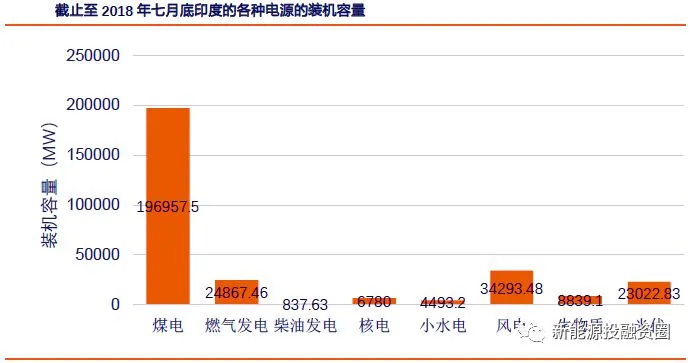 截至2018年7月底,印度全国公共事业电力生产装机容量约为345.49GW。其中水电(≥25MW)装机容量45.40 GW,核电6.78 GW,火电总计222.66GW,其他可再生能源电力(包含小于25MW的水电项目)装机容量70.65GW。风电34.29 GW,光伏23.02 GW,生物质8.83 GW,小水电4.49 GW。