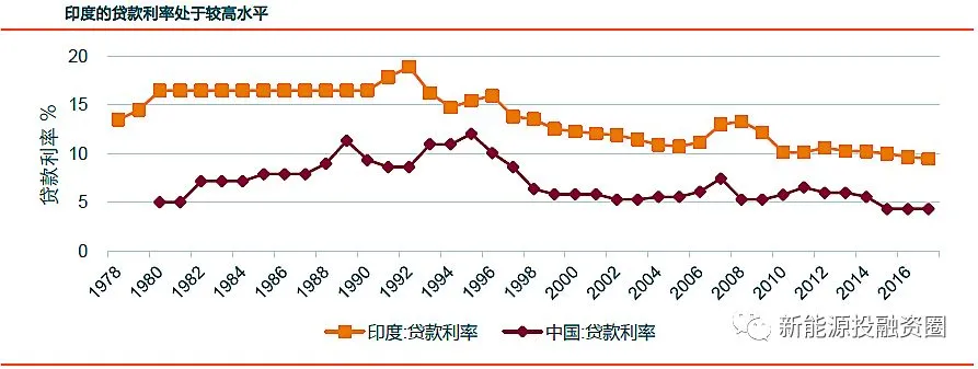 根据世界银行的数据,2017年印度的普通贷款利率为9.51%,虽然较2016年有所下降,但仍然处于较高水平,这也意味着,印度的光伏电站假如从印度国内银行融资,其实际承担的融资成本要大于10%,较高的融资成本在一定程度上提高了印度光伏发电的度电成本。