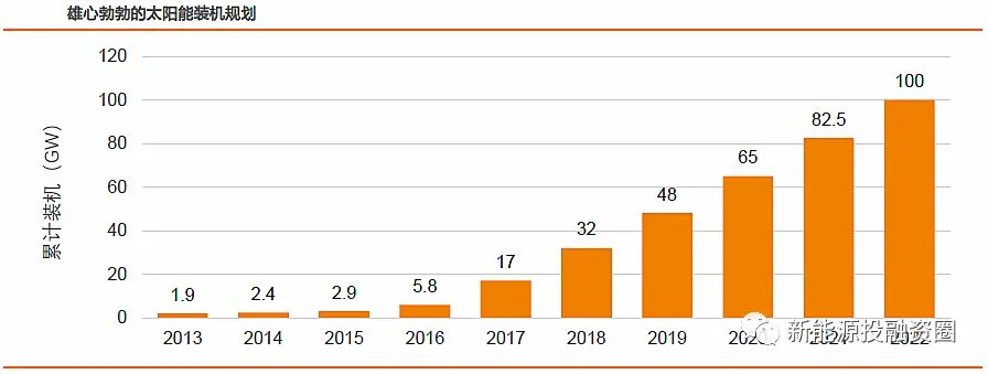 2014年1月,印度总理纳伦德拉˙莫迪公布太阳能振兴计划:到2022年,印度要实现可再生能源发电总量175GW,其中太阳能装机容量100GW(40GW太阳能屋顶发电项目和60GW大中型太阳能并网项目),总投资额约8000~10000亿元,2018年6月,印度政府上修国家可再生能源装机目标,提升至227GW,预计超过100GW将来自太阳能项目。截止到2018年7月底,印度共实现太阳能装机23.02 GW,离2022年100 GW的目标还有很大距离,若要保持按期完成,则未来4年平均每年要完成超过15 GW装机。