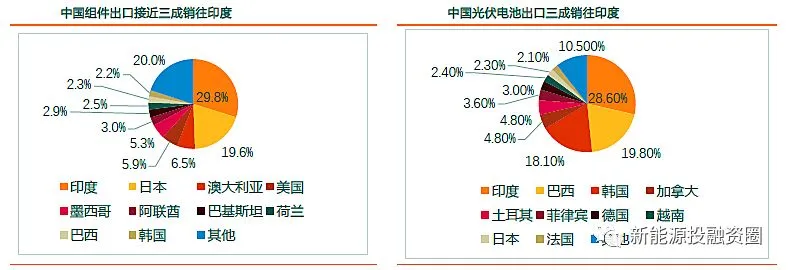 2017年12月,印度财政部发布公告,决定依据印度光伏生产商协会的申请对进入印度的太阳能光伏产品(包括晶体硅电池及组件和薄膜电池及组件)发起保障措施调查。2018年1月5日,印方做出该案初裁,印度保障措施总局向印度中央政府提出临时措施建议,即对进入印度的太阳能光伏产品征收70%的从价税作为临时保障措施税,为期200天。受该政策影响,2018上半年中国组件及电池片出口至印度仅约3.6GW及0.7GW,相比2017年同期减少了约33%。